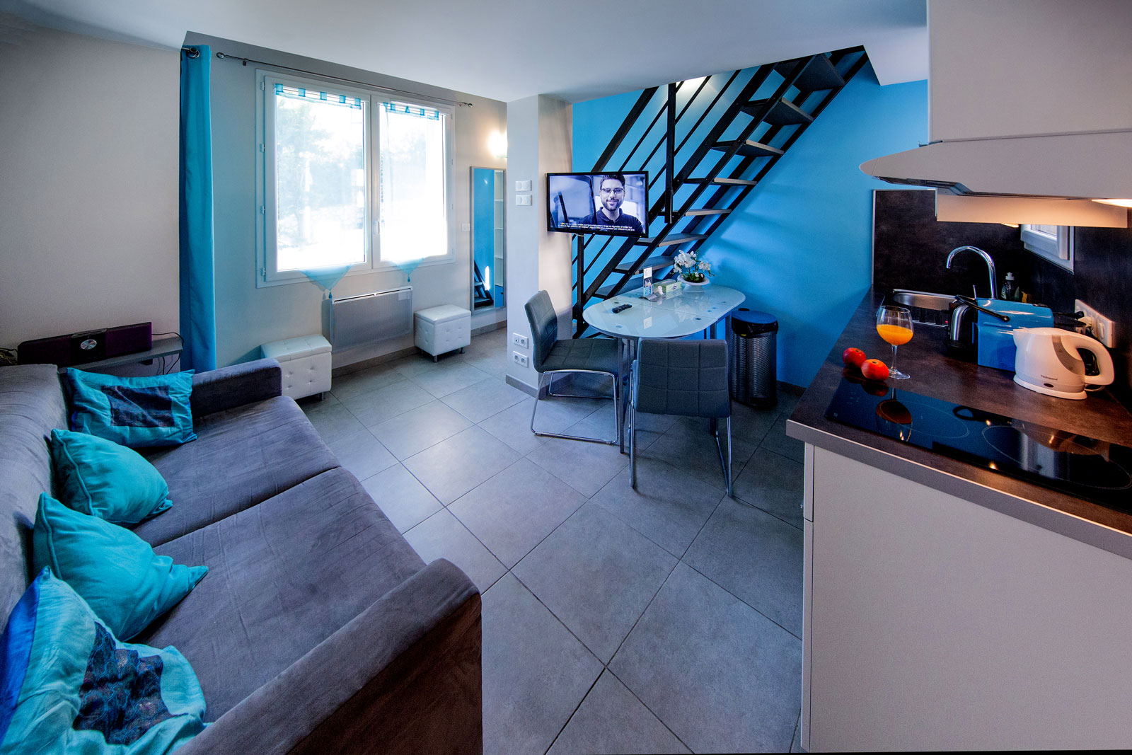 Appartement en duplex, salon cuisine en RDC et chambre à l’étage. Joli pied à terre aux couleurs bleutées.